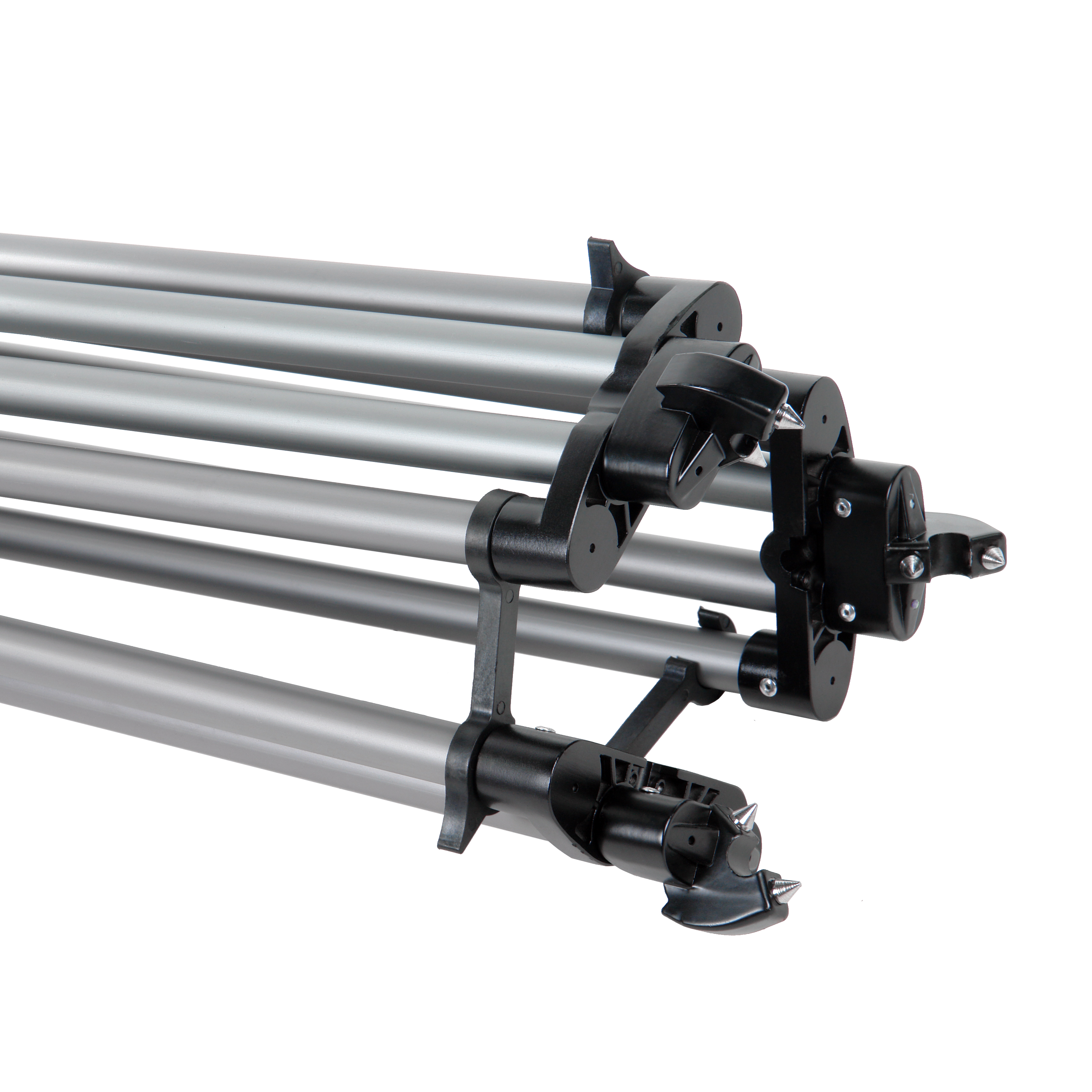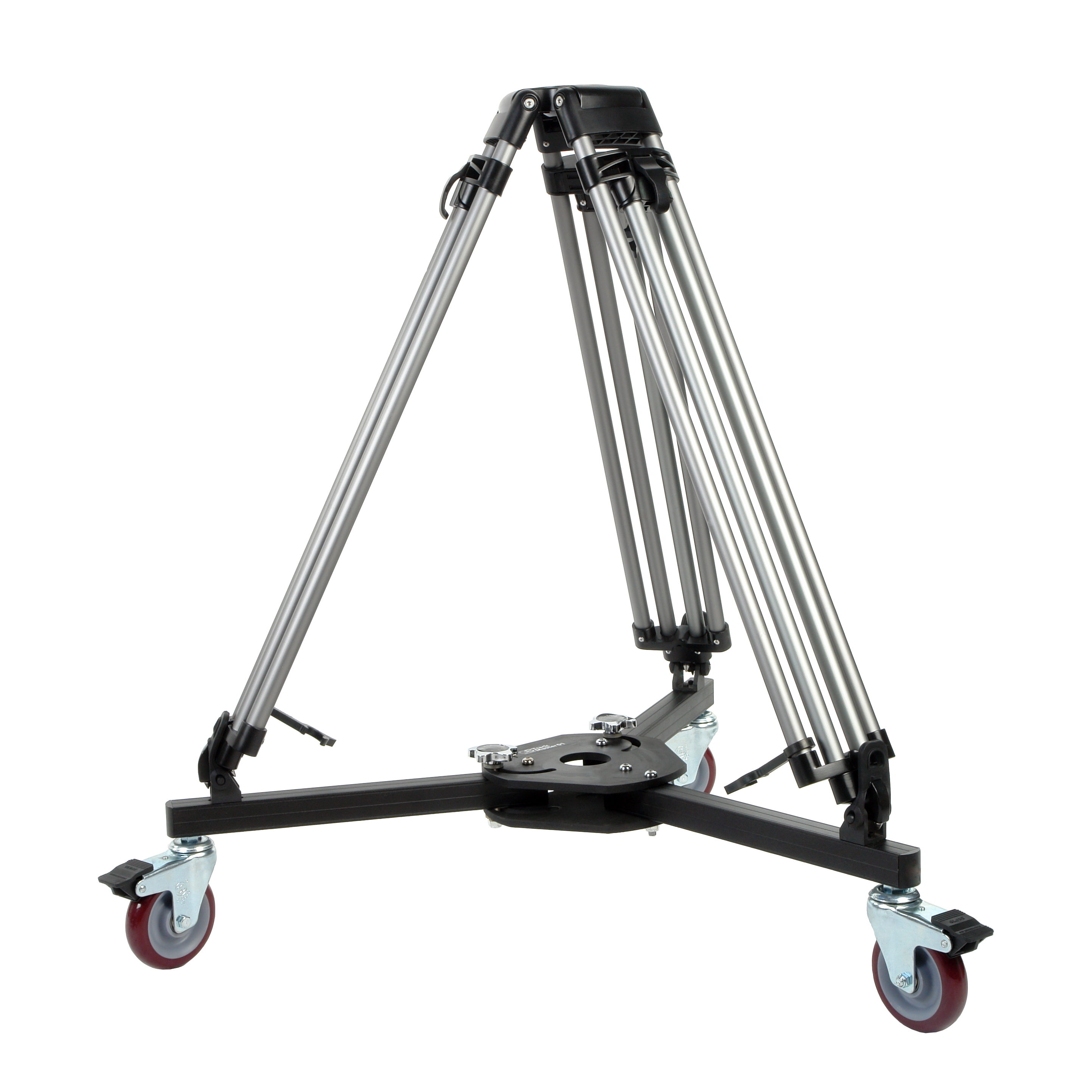 На тележку устанавливается алюминиевый штатив (тренога), регулируемый по высоте от 80 до 155 см. Прочность и жесткость штатива обеспечена за счет алюминиевого профиля диаметром 24 мм, а эффективное сопротивление кручению - за счет рамочной конструкции треноги. Тренога комплектуется съемной раздвижной растяжкой с резиновыми подпятниками.