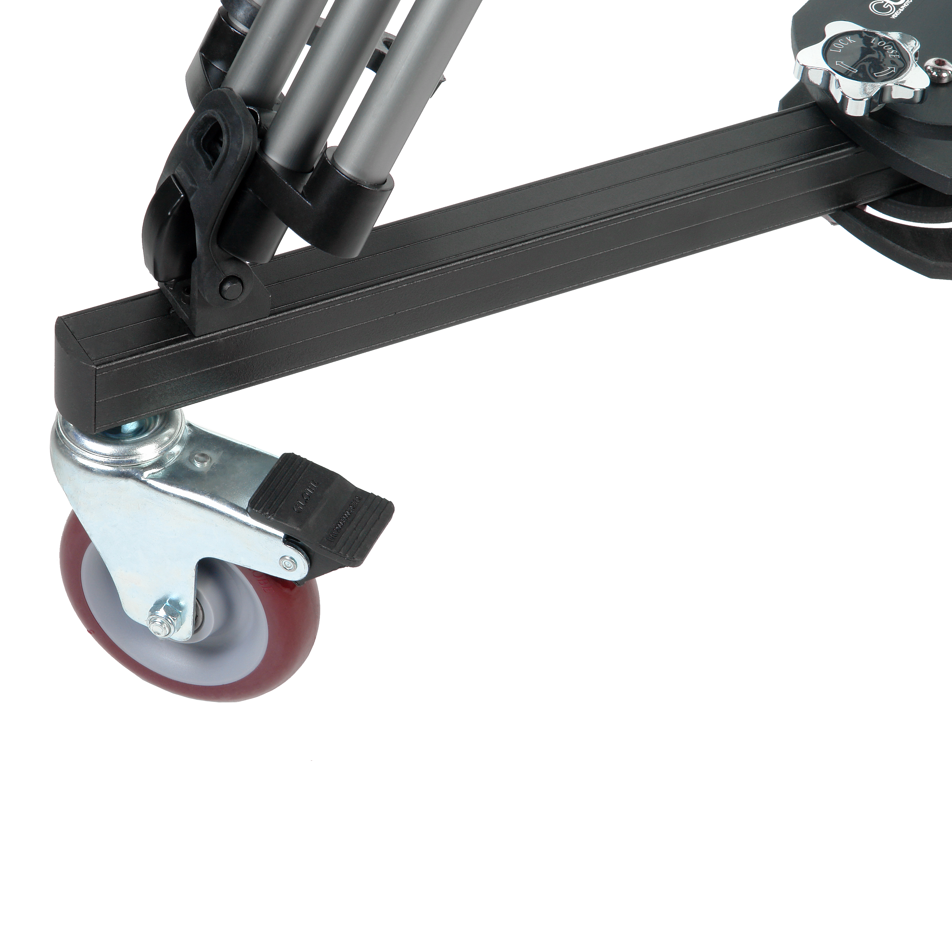 Основанием крана является тележка на колесах грузоподъемностью до 200 кг. Операторская алюминиевая тележка с радиусом крепления для штатива 92 см легко и быстро раскладывается в нужное положение и фиксируется двумя винтами. Благодаря трем колесам диаметром 130 мм тележку легко перемещать, для блокировки положения на каждом колесе предусмотрен тормоз.