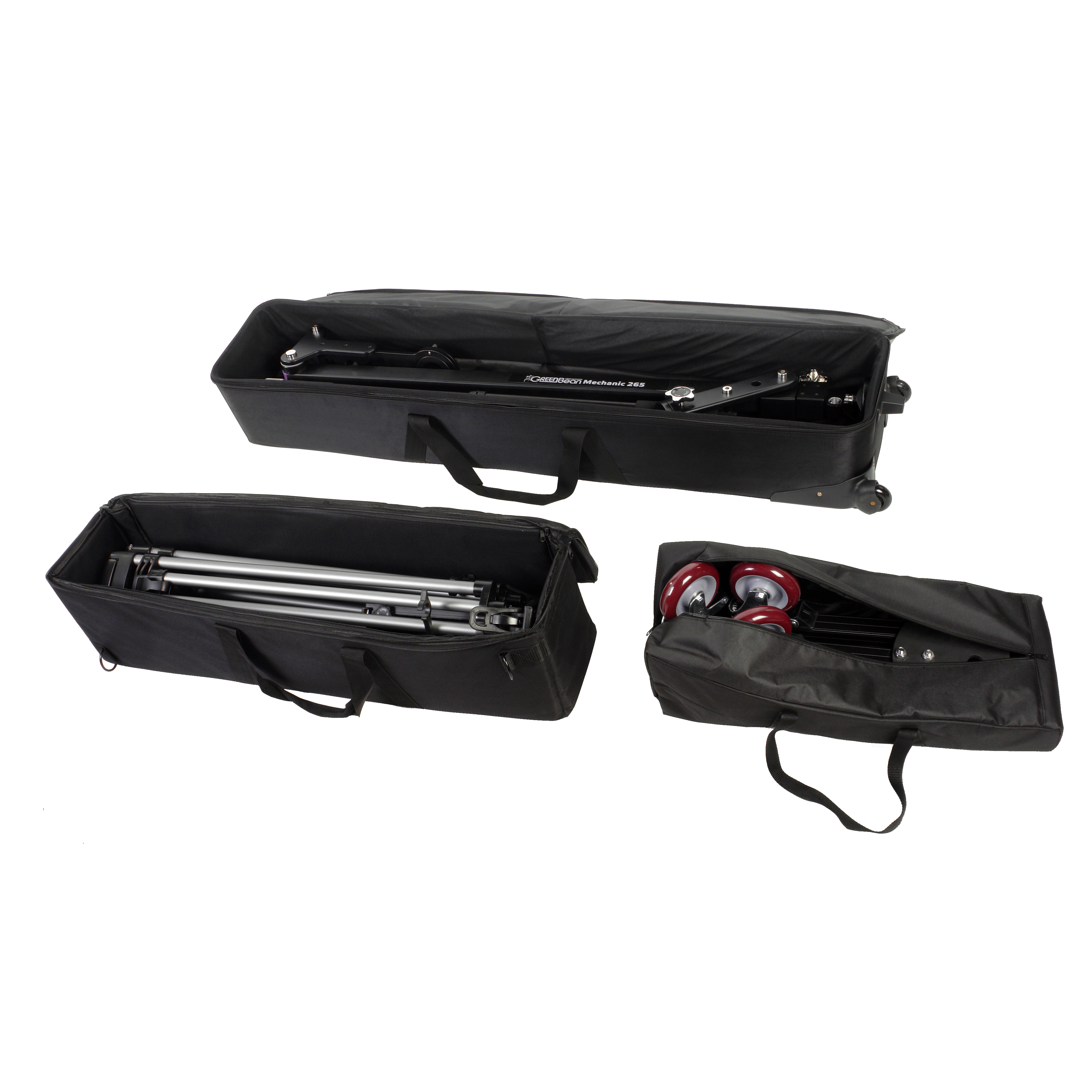 Mechanic 265 состоит из трех частей, упакованных в сумки-чехлы: тележки на колесах, регулируемого по высоте штатива и телескопической стрелы. Вес комплекта в сборке составляет 33,5 кг.