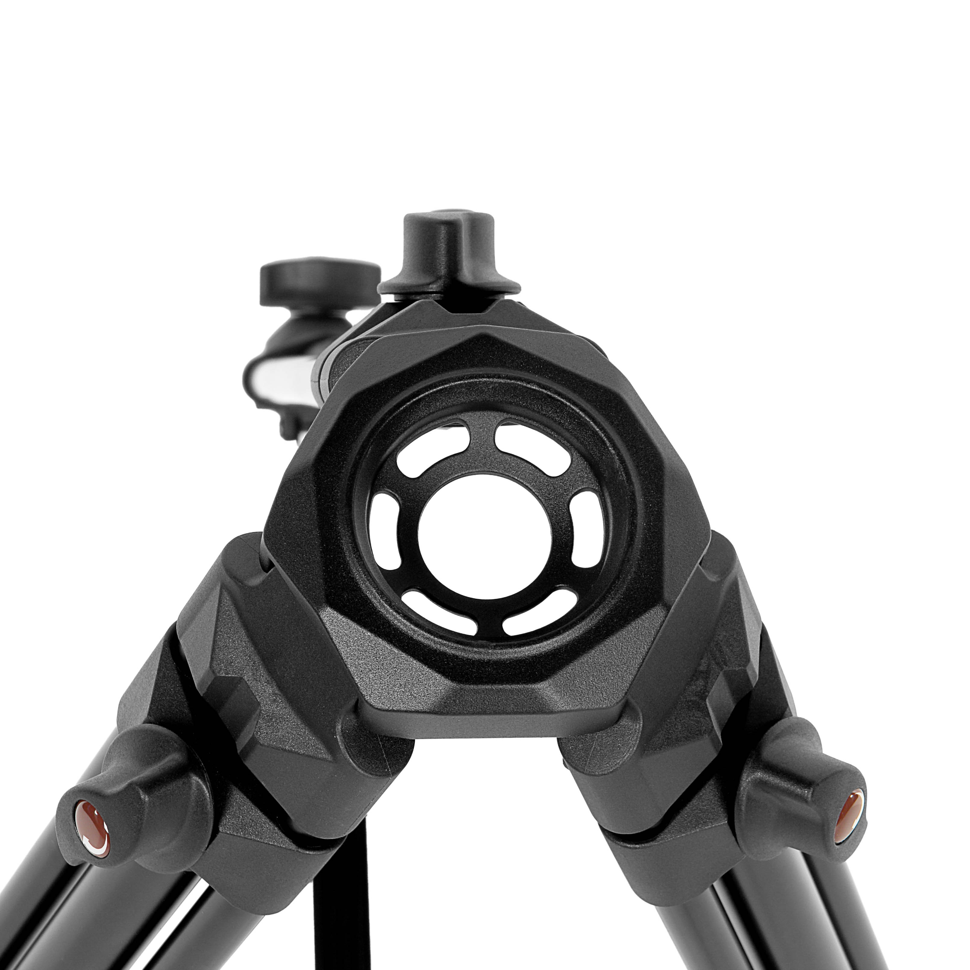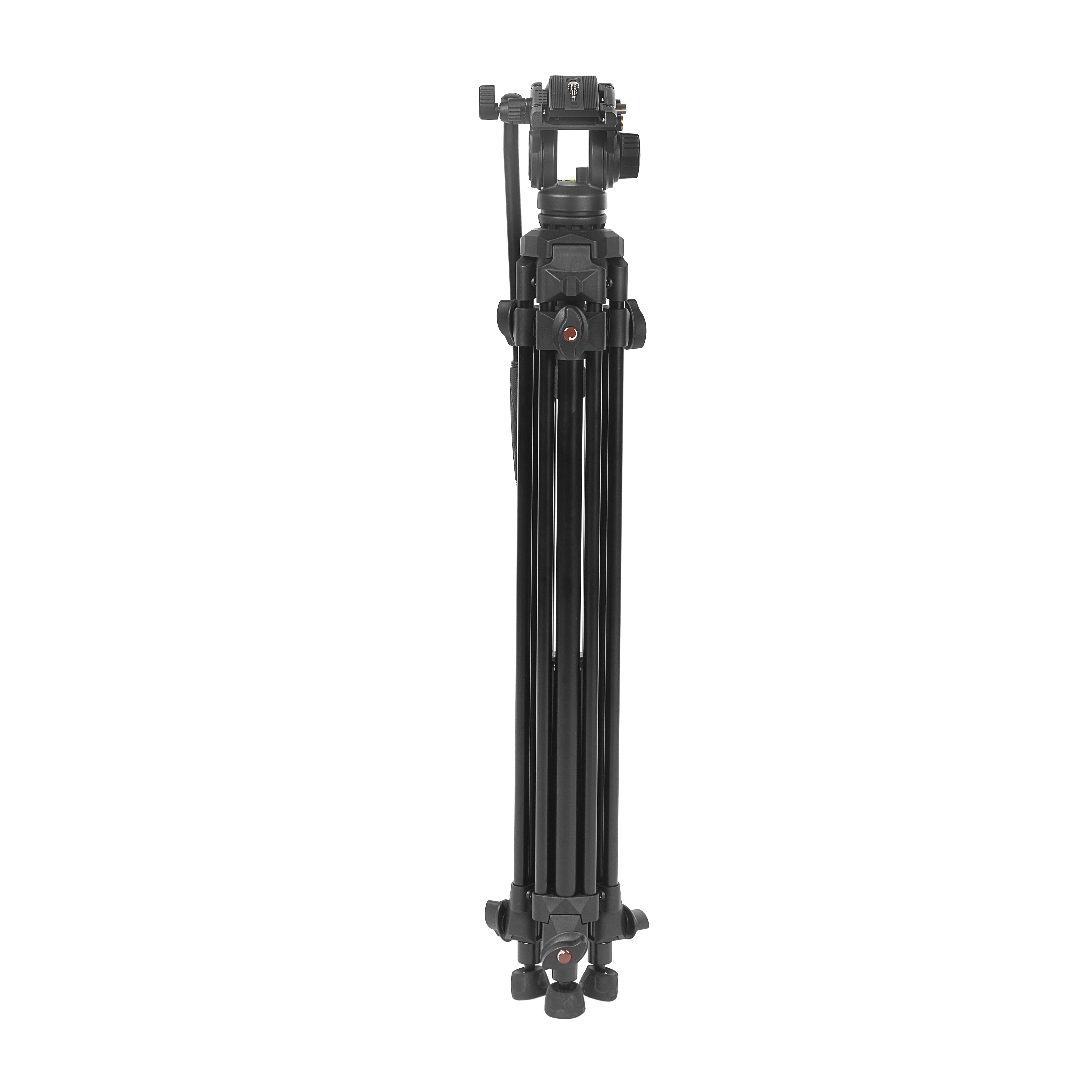 Трёхсекционные ноги со сдвоенной верхней секцией и прочной алюминиевой верхней растяжкой обеспечивают отличную устойчивость при минимальном весе. Фиксаторы и верхний узел выполнены из прочного пластика, что дополнительно облегчает конструкцию, не снижая надёжности. Крупные винтовые зажимы позволяют одной рукой быстро выдвигать и надёжно фиксировать секции. Резиновые опоры на шаровых основаниях отлично держат штатив на любой поверхности.